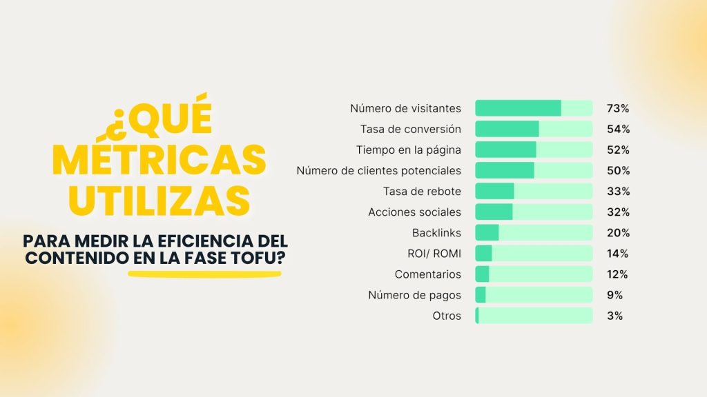 - Número de visitantes (73%): Esta métrica permite evaluar el alcance del contenido y determinar si está atrayendo un volumen adecuado de tráfico.