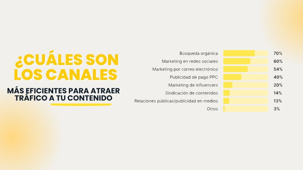 - Marketing en redes sociales (60%): Las redes sociales amplían el alcance y permiten compartir contenido de forma viral.