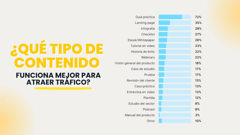 - Guías prácticas (72%): Este formato destaca como el más efectivo para atraer tráfico, según las estadísticas. Las guías prácticas ofrecen soluciones detalladas a problemas específicos y permiten a los usuarios obtener valor inmediato.